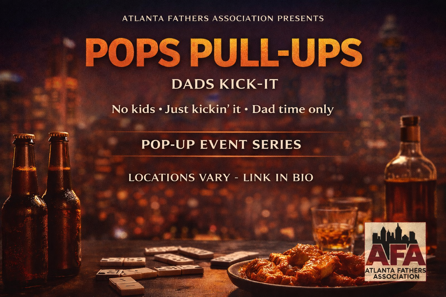 Pops Pull-Ups are AFA’s dad-only gatherings designed to give fathers space to unwind, build brotherhood, and connect outside of daily responsibilities.